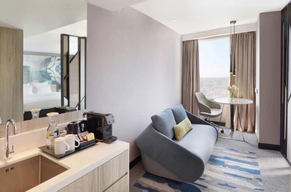 Fasilitas di dalam kamarnya pun sangat lengkap yaitu tempat tidur yang empuuuk, sofa bed, setrika, tv 50 inch hingga mini pantry yang terdiri dari microwave, tea, coffee, chiller dan sink di setiap kamar.