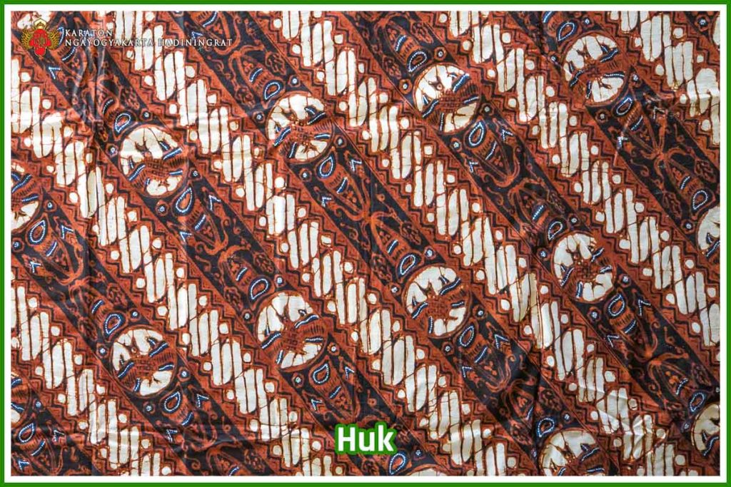 Gambar kerang yang bermakna kelapangan hati, tumbuhan artinya kemakmuran, sayap untuk ketabahan hati merupakan ciri khas dari motif Huk. Motif ini adalah simbol pemimpin berwibawa, cerdas juga tabah sehingga hanya raja dan putera mahkota yang boleh memakainya.