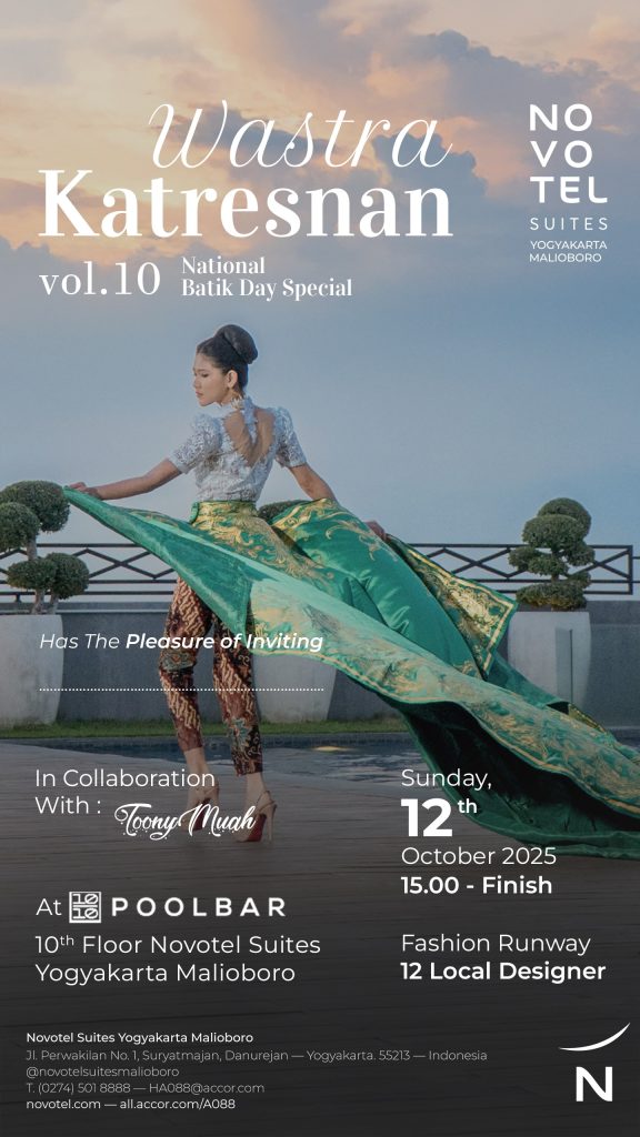 Oleh karena itu, jangan lewatkan Wastra Katresnan pada Minggu, 12 Oktober 2025, pukul 15.00 di 10/10 Pool Bar. Kapan lagi kamu bisa menyaksikan fashion show di rooftop dengan 360º Yogyakarta city view.