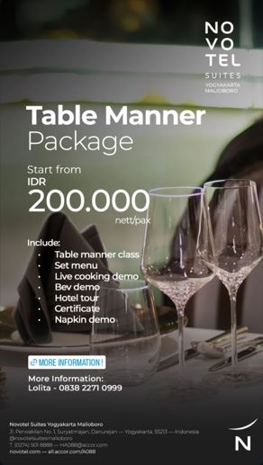 So, invite your friends to join the table manners class at Novotel Suites Yogyakarta Malioboro. If you have any further questions, please contact the number listed.